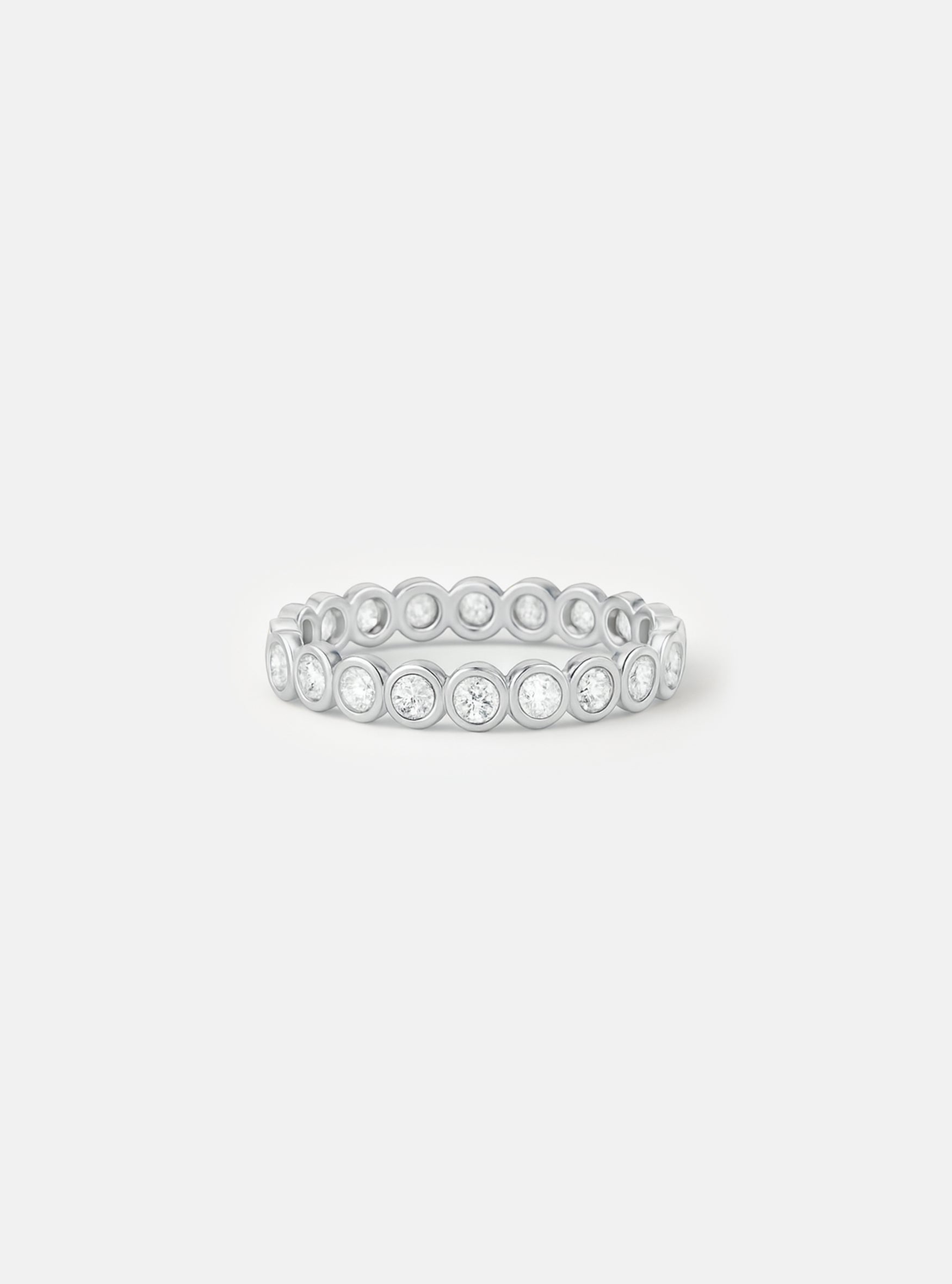 The Bubble Ring features a rounded silhouette set with a seamless row of brilliant-cut cubic zirconia, echoing the refined shimmer of a tennis bracelet in a modern, sculptural design.